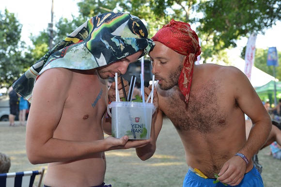 Hayatımda ilk defa geçen sefer, yine burada gördüğüm; kovadan içki durumu da ekstra eğlenceliydi. Bildiğin, çocukların plajda kale yaparken kullandığı kovaların içine, istediğin kokteyli yaptırıyorsun ve dev kamışlarla takılıyorsun. Çok da nefis oluyor. Bu sene festivalin bizden de bir sponsoru vardı: Yeni Rakı! Malum, ülkemizde artık yasalar içki firmalarının her hangi bir etkinliğe sponsor olmasını engellediği için, firmalar da rotayı yurt dışına kırmaya başladı. Yeni Rakı; bu ortamlar için hazırladığı özel kokteylleriyle her barda satılıyordu. Damla sakızlı modeli; bublle gum ekibin favorisi oldu.