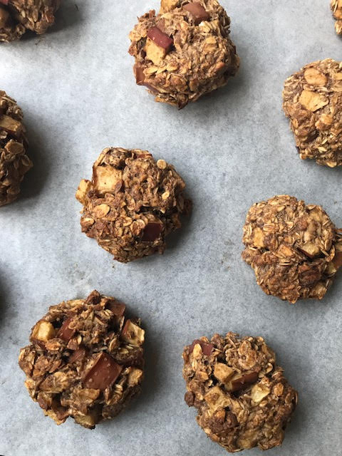 Hurmaları ılık suda 10-15 dk bekletip çekirdeklerini çıkarıyoruz, küçük küçük doğruyoruz. Elmayı da küp küp doğruyoruz. Önce sıvı malzemeleri güzelce karıştırdıktan sonra katıları da ekleyip güzelce bütünleştiriyoruz. Elimizle bastırarak yuvarlak şekil verip yağlı kağıt serili tepsiye yerleştirip önceden ayarladığımız 180 derece fırında 20 dk pişiriyoruz. Afiyet olsun.