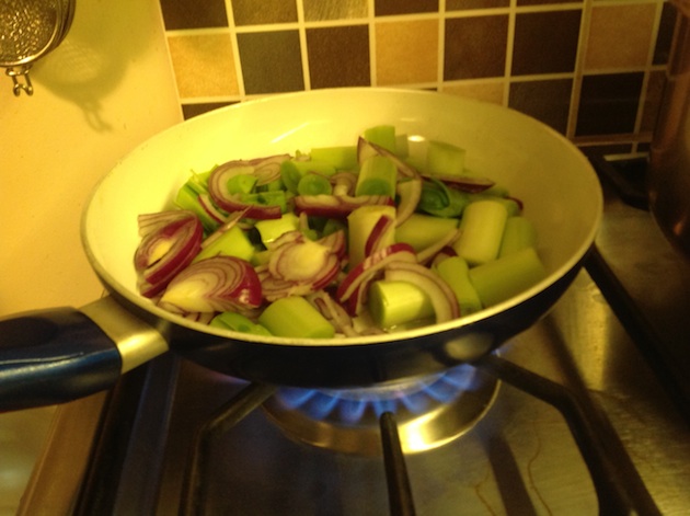 1. 5 dal pırasayı ve kırmızı soğanı doğradıktan sonra zeytinyağıyla kızgın tavanın içerisine atıp 3-4 dakika kavuruyoruz.
