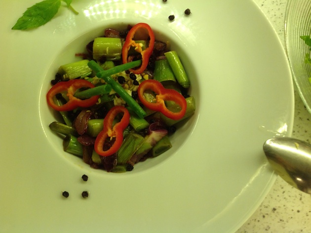 4. Pişen pırasaları bir tabağa aldıktan sonra üzerini yeşil soğan, kırmızı biber ve kuş üzümü ile süslüyoruz.