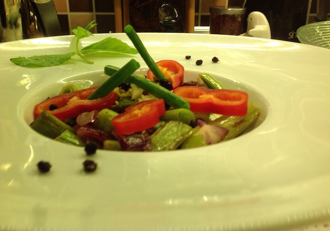 4. Pişen pırasaları bir tabağa aldıktan sonra  üzerini yeşil soğan, kırmızı biber ve kuş üzümü ile süslüyoruz.