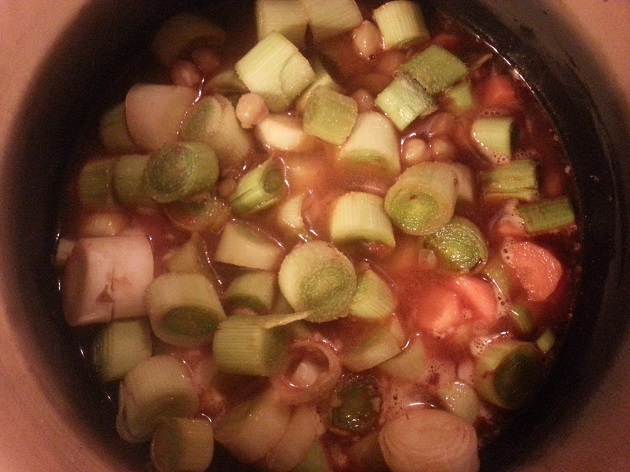 3. Nohut ve mercimek piştikten sonra güvece zeytinyağını döküp salça, pırasa ve havucu ekliyoruz. Yaklaşık 5 dk bu karışımı kavuruyoruz.