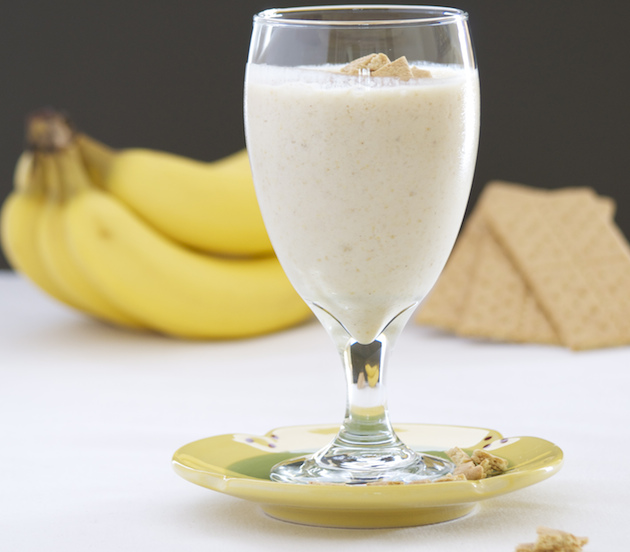- Donan muzları, yoğurdu, vanilyayı, yağsız sütü ve süt tozunu blendera atıp püre kıvamına gelene kadar karıştırın. Tüm malzemeler karıştıktan ve püre kıvamına geldikten sonra, içine ufalanmış bisküvileri de ekleyerek hafifçe karıştırın. Smoothieniz servise hazır!