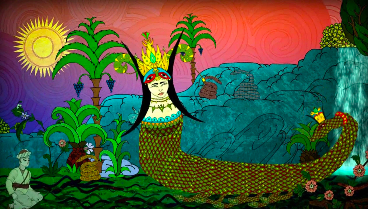 Cemşab’ın karşısında, güzelliğiyle onu büyüleyen genç bir kadın vardır: Şahmaran! Vücudunun alt kısmı tıpkı bir yılanınkine benzeyen Şahmaran’ı gören genç adamın şaşkınlıktan adeta dili tutulur. Çok geçmeden Şahmaran, Cemşab’a kendisini tanır, korkmamasını söyler ve ne kendisinin ne de yılanların ona zarar vermeyeceklerine dair güvence verir. Çünkü Şahmeran’ın hükmettiği yılanlar, sıradan yılanlar değil; zeki, merhametli ve barışçıl yılanlardır.