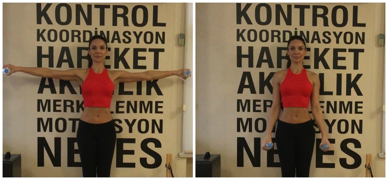 Omuz kaslarınızı çalıştırır. Hareketi yaparken dirseklerinizi hafif bükün ve kollarınızı omuz hizasına kadar kaldırın. En az 10 tekrar yapın.