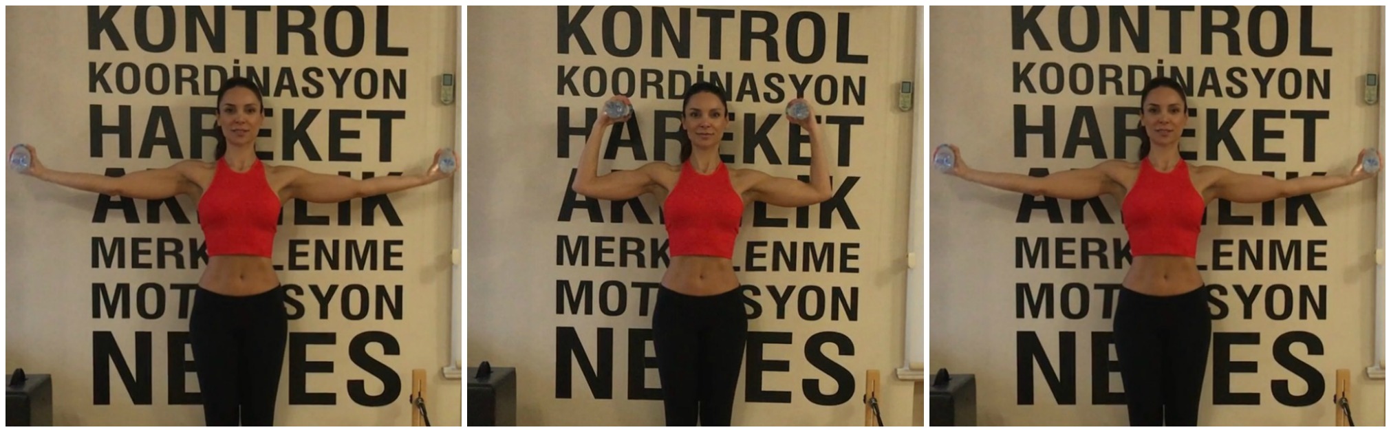 Ön kol kaslarınızı çalıştırır. Kollarınızı yanlarda omuz hizasında açın ve avuçlarınızı yukarı çevirin, dirseklerinizi bükün ve tekrar başlangıç pozisyonuna dönün. En az 10 tekrar yapın.