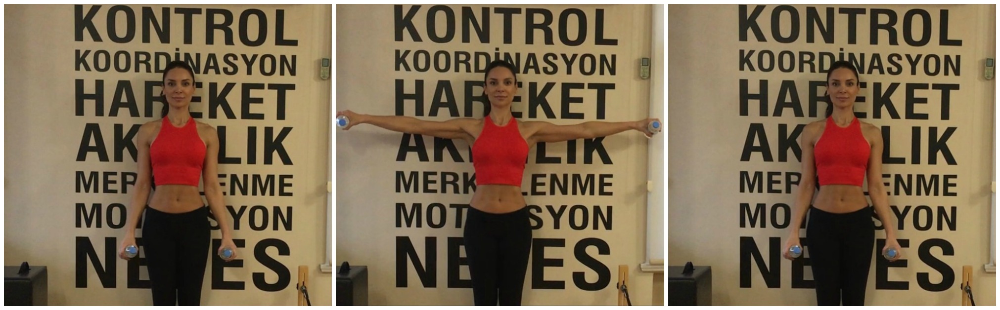 Hareketleri uygularken dik bir duruşa gelin. Ayaklarınızın arasında yaklaşık kalça genişliği kadar mesafe olsun. Hareketleri ayakta ya da oturarak yapabilirsiniz ancak ayakta yaptığınızda belinize binen yük daha az olacaktır. Nefesi burnunuzdan alın ve kolları yukarı kaldırdığınız yani zorlandığınız yerlerde ağzınızdan nefes verin, bu şekilde nefes alıp vermek hareketlerin tekrar sayıları arttığında size güç verecektir.
