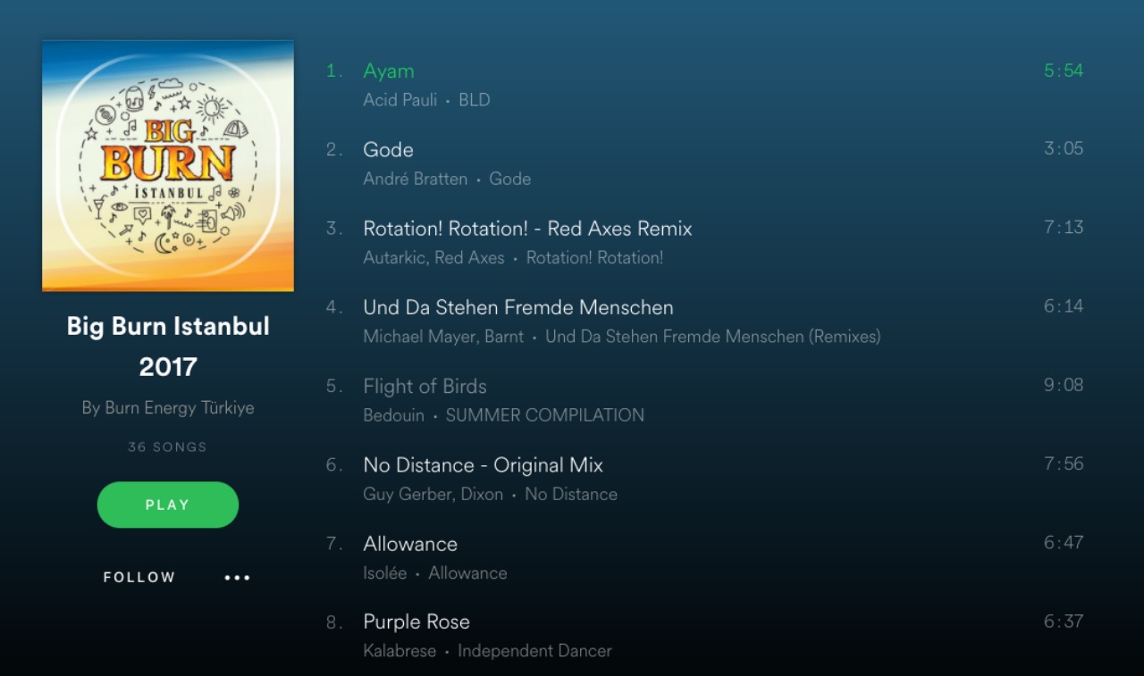 İstanbul’da bu hafta yerli-yabancı 100 farklı DJ katılımıyla Suma Beach’te Burn Enerji desteği ile 60 saatten fazla kesintisiz müziğin olacağı büyük bir festival düzenleniyor: Big Burn! Richie Hawtin, Acid Pauli, Luciano, Bedouin, Loco Dice, Dixon gibi ünlü isimlerin sahne alacağı bu büyük festivale katılacak isimlerin parçalarından oluşan liste haftanıza enerji katacak.