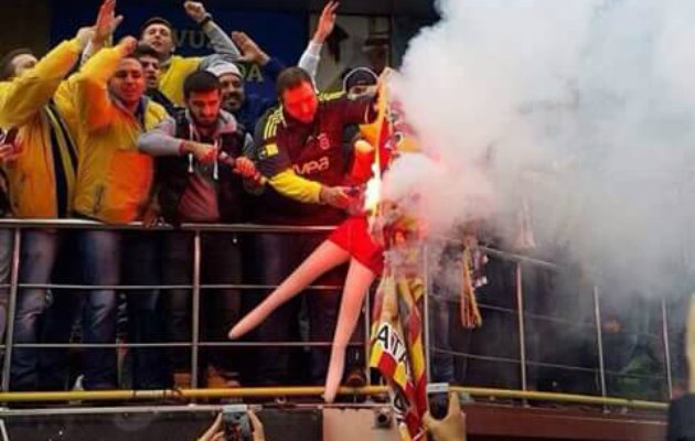 Fenerbahçe taraftarları tarafından bir şişme kadın bebeğe Galatasaray forması veya bayrağı giydirildi (ve belki de yakıldı). Japon bayrağını ise yeni öğrendim.