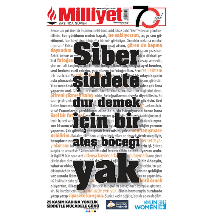 Birleşmiş Milletler Kadın Birimi (UN Women), 16 Günlük Aktivizm – Kadınlara Yönelik Şiddete Son Kampanyası kapsamında bu sene kadınlara ve kız çocuklarına yönelik siber şiddete dur diyecek 1 milyon kişi arıyor. 25 Kasım – 10 Aralık tarihleri arasında düzenlenecek olan kampanya, herkesi www.atesbocekleri.info sitesinde siber şiddet ile ilgili testi çözmeye ve arkadaşlarını meydan okumaya (challenge) davet ediyor.