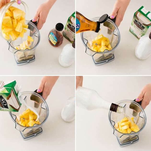 2. Ananas, muz, agave şurubu, hindistan cevizi sütü ve likörü bir miksere koyun. Malzemeler bir araya gelene kadar güzelce karıştırın.