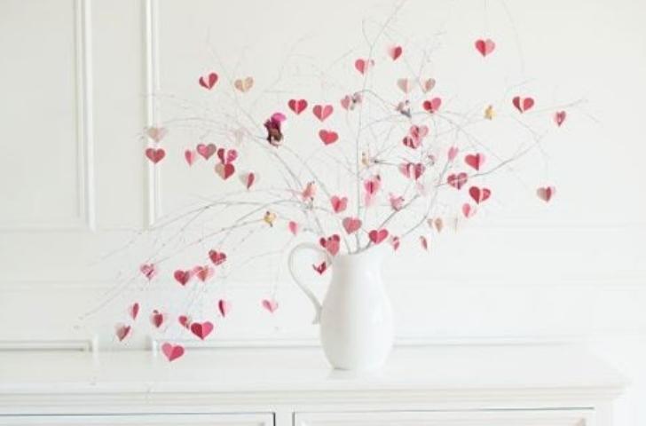 Dilediğiniz renk sprey boya ile kuru dallarınızı ve vazonuzu boyayın. Kalp şeklinde kestiğiniz renkli kağıtları bir kenara ayırın. Kuruyan dalların üzerine bu kağıtlardan rastgele renklerde yapıştırın.