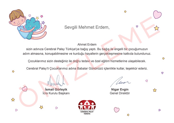 Cerebral Palsy, bebeklik ve çocukluk döneminde en sık rastlanan fiziksel engellilik durumudur. Türkiye’de her yıl 6.000’den fazla çocuk Cerebral Palsy tanısı alıyor. Cerebral Palsy’lilerin yaşam boyu ihtiyaç duydukları özel eğitim ve rehabilitasyon hizmetlerine kavuşmalarını sağlamak ve toplumda farkındalık yaratmak için faaliyetlerde bulunan Türkiye Spastik Çocuklar Vakfı- Cerebral Palsy Türkiye, duyarlı bireyleri, hediyeye alternatif olarak bağış yapmaya davet ediyor. “İyiliği” hediye ederek, siz de çocukların yüzündeki gülümsemeye ortak olmak için bagis.tscv.org.tr üzerinden “Sertifika Bağışı”nı ve ardından “Babalar Günü”nü seçebilirsiniz.