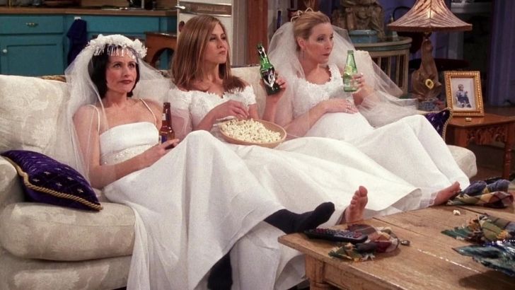 Dizinin aslında her sahnesi Friends karakterleri arasındaki güçlü bağı ortaya koyar nitelikte. Fakat, üç kız arkadaşın hayatlarındaki tüm olumsuzluklara ve ters giden ilişkilerine rağmen bir arada durarak birbirlerine destek oldukları, üçünün de gelinlikle oturdukları sahne en sevilen kısımlardan bir tanesi. Birbirlerini eleştirmek yerine fikirlerini benimsemeyi ve eğlenmeyi tercih eden arkadaşlık ilişkileri, hepsinin mutlu olmasına en büyük neden.