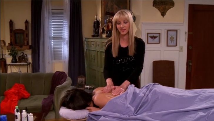 Bir masöz olan Phoebe’nin içinde bulunduğu masaj sahneleri dizide oldukça fazla. Yakın arkadaşı Monica, Phoebe’den utandığı için başka bir masöze gider, Phoebe ise bunu fark ettiğinde ona çok kızar ve bir profesyonel olarak ona masaj yapmayı teklif eder. İlk deneyimden sonra Monica çok memnun kalarak devam etmek ister. Tabii masaj seansları daha sonra devam etmez, izleyenler nedenini hatırlayacaktır. 🙂
