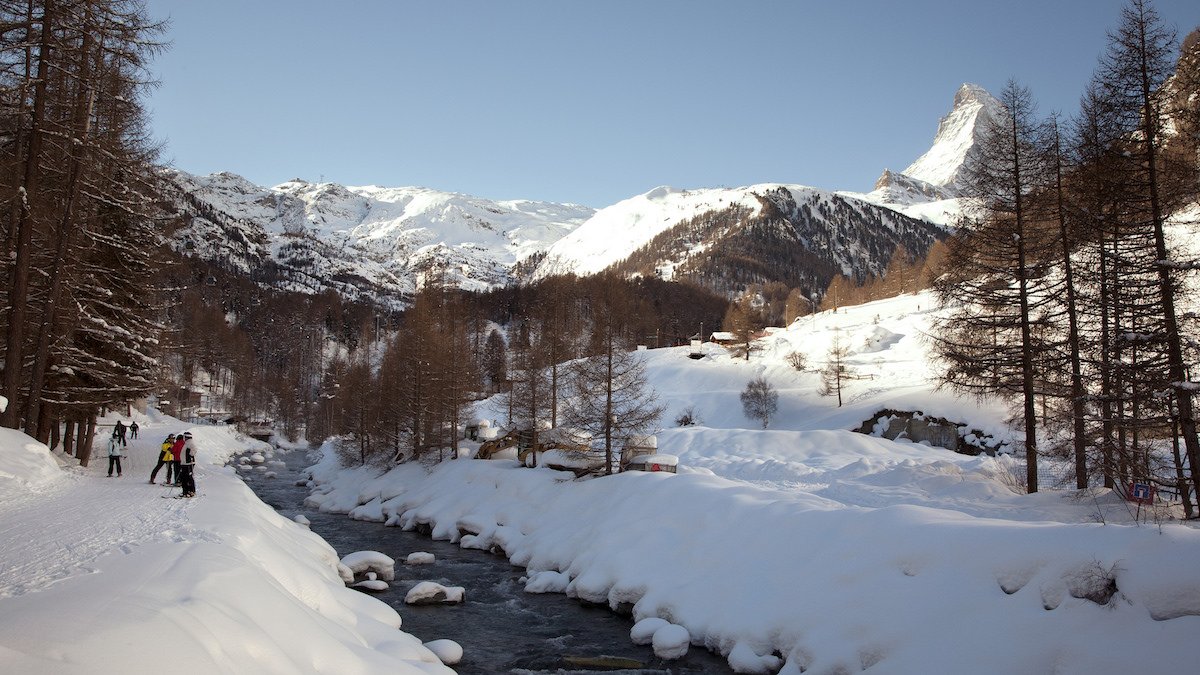 Zermatt'ın yağlı boya tablolarından fırlamış manzarasına karşı kayak yapın. / İsviçre