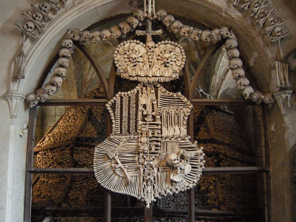 Sedlec Ossuary Kilisesi'nde kemiklerden yapılmış olan avizenin altından geçin. / Çek Cumhuriyeti