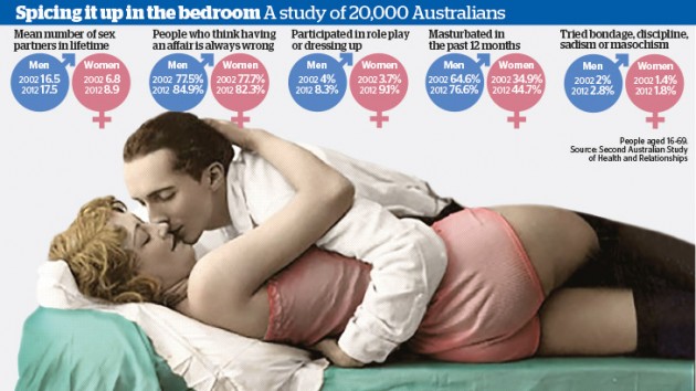 New South Wales, La Trobe ve Sydney Üniversiteleri’nde yapılan bir araştırmada, 16-69 yaş arası 20.000 kişiyle telefonda röportaj yapılıyor. Bu röportajlara göre, bireyler son 4 hafta boyunca her hafta ortalama 1.4 kez cinsel ilişkiye girdiklerini belirtiyorlar. 10 sene önce yapılan araştırmada ise bu rakam haftada 1.8’di.