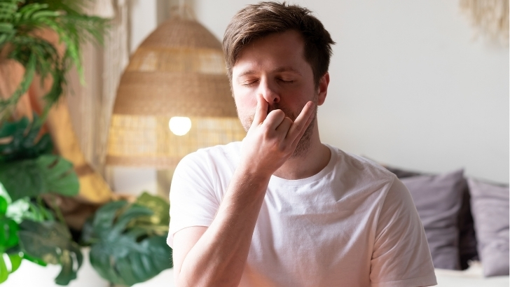 - Sol burun deliğinden nefes alın ve sonrasında sol deliği sağ serçe ve yüzük parmaklarınızla kapatın.