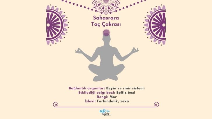 Sanskritçe ismi Sahasrara olan taç çakra, ilahi bilgeliğin, bilincin, aydınlanmanın, hayal gücünün, optimizmin, maneviyatın ve yüksek benlikle (ilahi güç, Tanrı, evrensel bilinç, evren gibi) olan bağlantımızın merkezi olarak görülüyor. Fiziksel tüm formların ötesine geçen taç çakra özveri, inanç, adanmışlık, açık fikirlilik, zeka ve etik değerler gibi özelliklerle kendini gösteriyor.