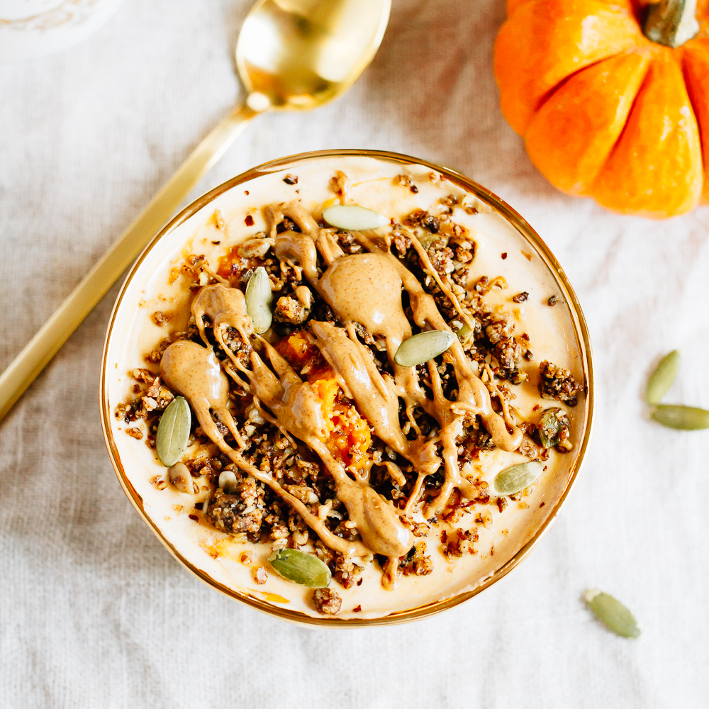 Pumkin Spice Latte sizi kesmedi mi? Yoğurdunuzun içine biraz balkabağı püresi, biraz tarçın biraz da muskat koyup üzerini balla tatlandırın. Balkabağı çekirdekleri ve pekan cevizi ile süsleyip tatlı krizinizi yalancı balkabaklı tart bastırın!
