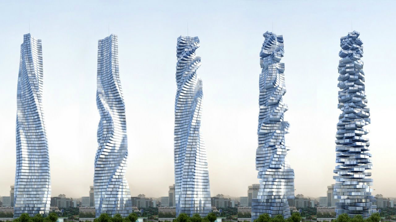 Gördüğünüz bu güzel binalar 59 bağımsız dönen modülden/zeminden oluşuyor. Dönen zeminler sayesinde ev sakinleri dış dünyayı her gün farklı bir açıdan gözlemleyebiliyorlar. Her zemin, dakikada ortalama 6 metre dönüyor ve ev sakinleri bu dönüşü hissetmiyorlar. Bağımsız dönüşler sayesinde binalar sürekli farklı bir görünüşe sahip oluyor.