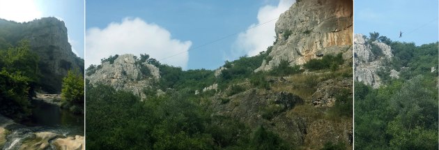 Kanyonun orta kısımlarındaki geniş alanda, etraftaki kayalarda tırmanış yapanları seyretmek için biraz dinlendiğimiz sırada, özellikle slackline yapan biri dikkatimiz çekti. İki kaya arasına gerilmiş ip üzerinde, sadece bir koruma halatı ile dengede durmaya çalışan gencin görüntüsü yukarıdaki görselde, en sağdaki resimde görülebilir.