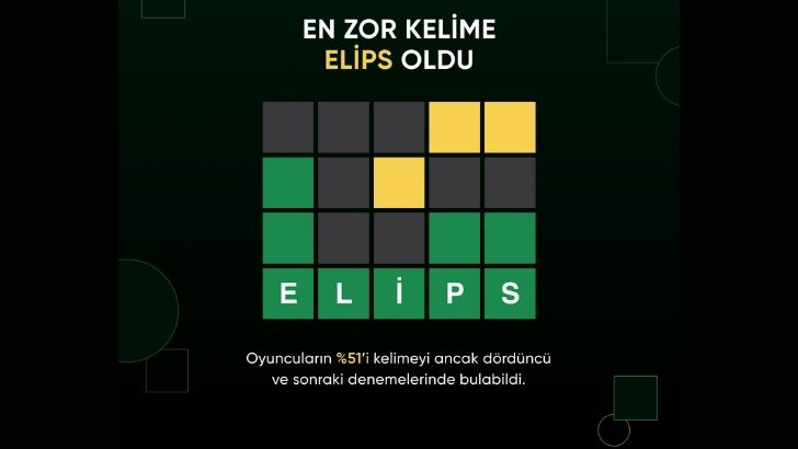 Wordle Türkçe oyuncularının bulmakta en çok zorlandığı kelime “Elips” oldu. Oyuncuların %51’i kelimeyi ancak dördüncü ve sonraki denemelerinde bulabildi. Oyuncuların ortalama kelime tahmin süresi ise 3 dakika 32 saniye.