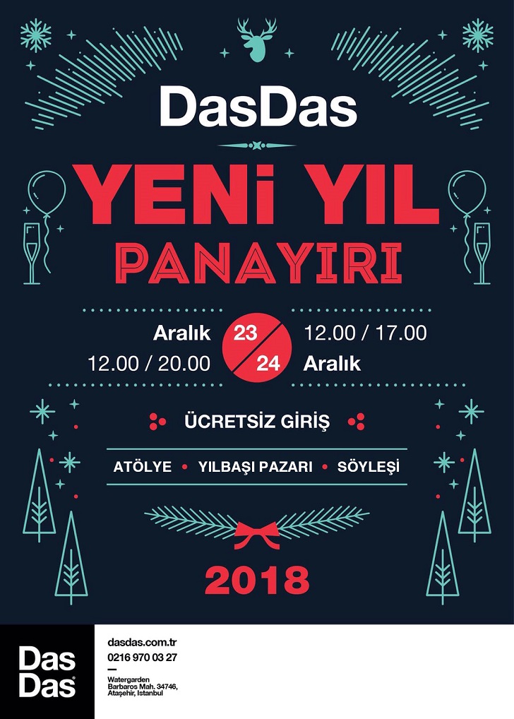 Üretmeyi, paylaşmayı ve eğlenmeyi sevenler için keyifli bir etkinlik haberimiz var. Mert Fırat, Koray Candemir, Didem Balçın, Muzaffer Yıldırım ve Harun Tekin’in kurucusu olduğu kültür ve sanat mekanı DasDas, 23 – 24 Aralık tarihlerinde gerçekleşecek Yeni Yıl Panayırı ile sanat, tasarım, beslenme ve sağlıklı yaşam gibi birçok farklı alanda çocuklara ve yetişkinlere yönelik ücretsiz atölyeler, söyleşiler ve yılbaşı pazarı düzenliyor. Panayır, DasDas’ta iki gün boyunca renkli ve enerjisi bitmeyen bir yeni yıl ruhu da yaşatacak.
