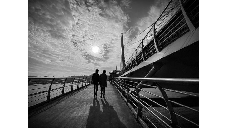 Haliç üzerine yapılmış olan metro köprüsünden geçen yayalar.