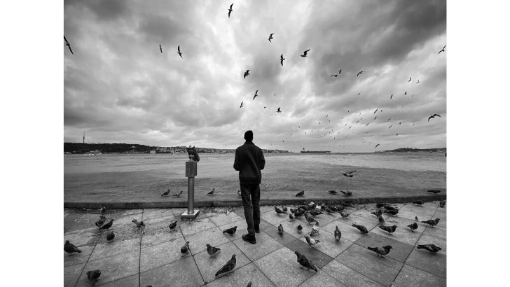 iPhone 11 Pro’nun üçlü kamera sistemindeki Telefoto, Geniş ve Ultra Geniş kameralarını kullanarak çektiğim üçlü pozlar için seçtiğim fotoğraf serisi Beşiktaş sahilden. İnsan fotoğrafları çektiğim için sabit bir durum bulmam gerekiyordu. Soğuk ve yağmurlu bir gündü ve çok az insan vardı. Hatta bazı zamanlarda neredeyse sadece kuşlar vardı. Aynı mekana tekrar gittiğimde şemsiyeli bir adamın uzun uzun denize baktığını ve hat üzerinde yürüdüğünü gördüm. Ve fotoğrafı çekmek istediğim yerde durmasını bekledim bir süre. Işık tersten geliyordu, bu sayede şemsiye daha görünür oldu ve ıslak zeminde oluşan yansıması da görsel açıdan fotoğrafı güçlendirdi.