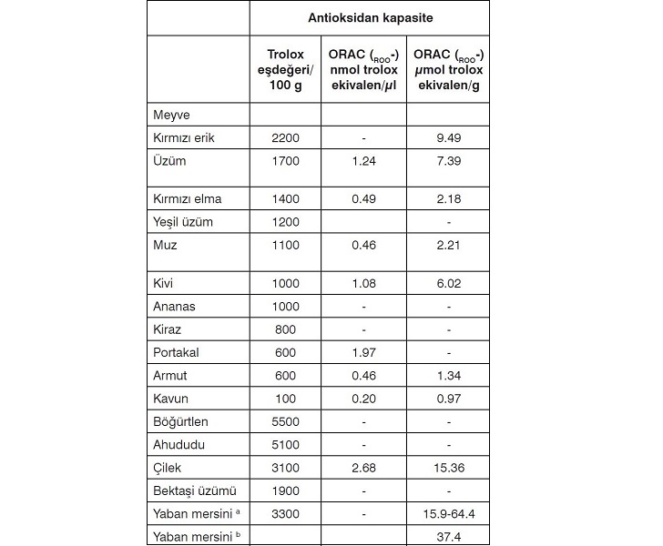 Üzümsü meyvelerin antioksidan düzeyleri Oksijen Radikalleri Absorbans Kapasitesi (ORAK) ile ölçülerek belirlenmektedir. ORAK, gıdalarda ve diğer kimyasal maddelerdeki antioksidan gücün ortaya çıkarılmasını test eden bir tür analizdir. Tabloda üzümsü meyvelerin ORAK değerleri, yani antioksidan kapasiteleri belirtiliyor.
