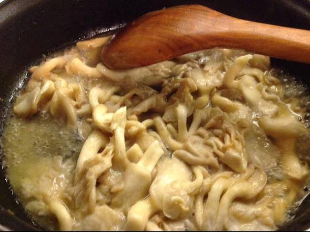 5. Başka bir tavada doğranmamış istiridye mantarlarını sularını salana kadar kavuruyoruz.