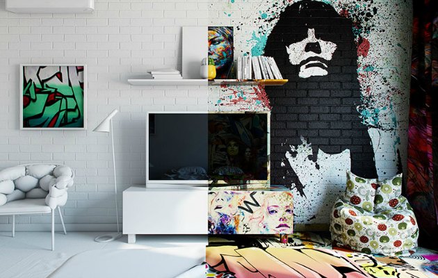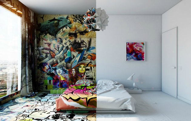 İşte sizlere yarısı grafiti yarısı beyaz olan otel odası dizaynlarından bazı örnekler: