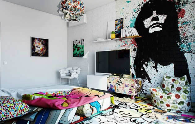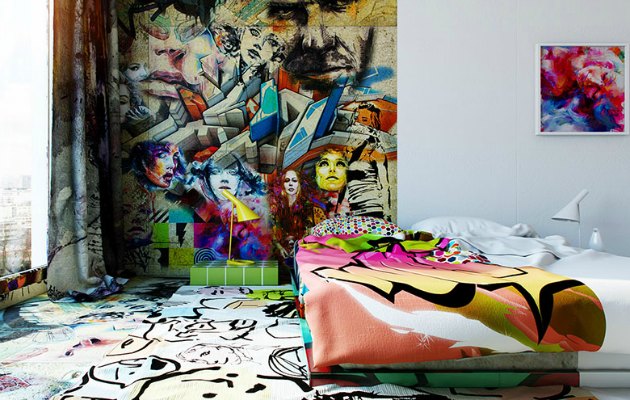 Ukraynalı sanatçı Pavel Vetrov çok güzel bir otel odası tasarımına imza atıyor. Kaos ve sokakların renginin sert tezatını ortaya koymaya çalışan sanatçı, sokak sanatının minimalist örneklerini otel odalarına taşıyor.
