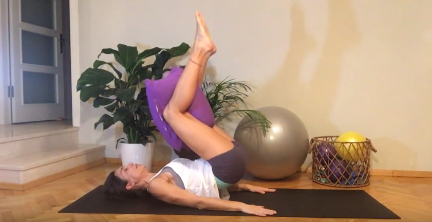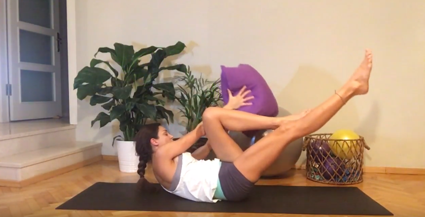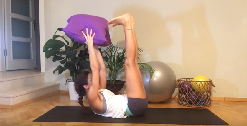 Bu kez yastığı ayak bileklerinin arasına yerleştirin. Omuzları ve başı kaldırarak yastığı bileklerden ellerinize alın ve hareketi tekrarlayın.