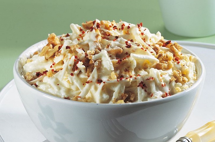 - Yoğurt sosunu rendelenmiş kereviz ile karıştırdıktan sonra salatayı geniş bir servis tabağına alın.