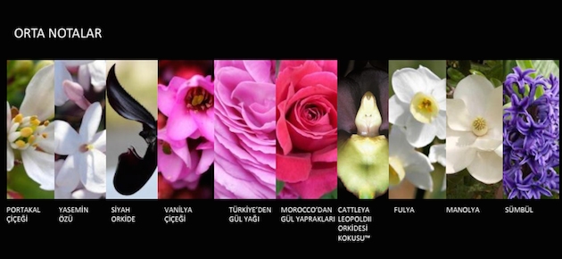 Çiçeksi özü bedeninizi saran çiçek notaları ile dolu. Velvet Orchid Türkiye’den temin edilen Yasemin özü ve gül yağından oluşuyor. Lezzetli, Cattleva Leopoldii orkide Kokusu—Kıyı Güney Brezilya ormanlarından gelen fuşya orkidesi— parfümün üzerine hafif bir çiçeksi koku veriyor. Portakal çiçeği ve Fas gülü esansı bu çiçeksi kokuya zenginlik ve kimlik kazandırıyor. Heliotropin kırılgan çiçeği tozlaştırırken, neredeyse yenilebilir derecedeki nektar aromasını ise arttırıyor. Manolya, Fulya ve Sümbül parfümün oldukça şehvetli ve kadınsı çiçeksiliğine farklı ve zıt bir anlam katıyor.