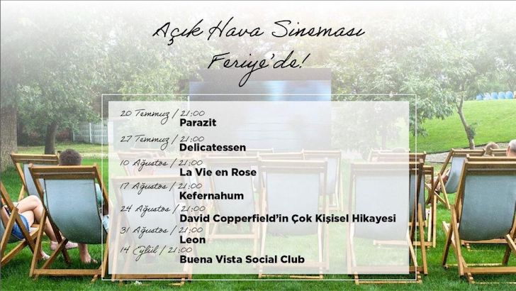 20 Temmuz itibarıyla Feriye’de başlayan Açık Hava Sineması’nda ilk film yönetmen koltuğunda Bong Joon-ho’nun oturduğu Oscar ödüllü Parazit filmi. Yaz boyu belirlenen tarihlerde, saat 21:00’da başlayacak olan diğer açık hava sinema gösterimleri ise şöyle: