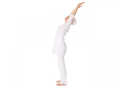 1. Dizleriniz ve topuklarınız birbirine bitişik olacak şekilde dimdik bir duruş yakalamaya çalışın. Dengede kalmak için ayaklarınızı 45 derecelik açıyla dışarı doğru açın. Baş, kollar ve omurga arkaya doğru nazikçe uzarken kollarınızı başınızın üzerinde esnetin ve 20 derecelik açıyla arkaya eğilin. Kollarınızın kulaklarınızla aynı hizada kalmasına izin verin. Avuç içleri ileri bakmalıdır ve kollarınızı yukarıda bu şekilde tutmakta çok zorlanırsanız başparmaklarınızı birbirine geçirerek buradan destek alabilirsiniz. “Mucizevi Esneme” olarak da adlandırılan bu duruşta 2 dakika kalmaya çalışın ve bu sırada uzun, derin nefesler alarak bedeninizi dinleyin, sakinleşin.