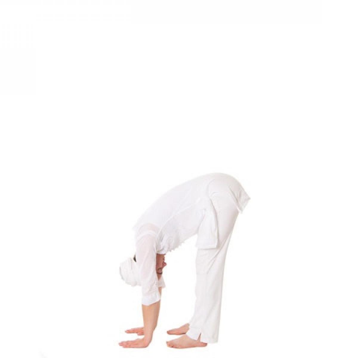 2. Acele etmeden belinizden bükülerek aşağı doğru eğilin ve ellerinizi zemine değdirmeye çalışın. Bu sırada kollarınızın kulaklarınızla aynı hizada kaldığından emin olun ve esneyebildiğiniz son noktaya ulaştığınızda kollarınızın zemine doğru rahatça sallanmasına izin verin. Nefes alın ve nefesinizi tutun, bu sırada karnınızı yapabildiğiniz kadar şişirip ardından içinize çekin. Nefesinizi verin, bir süre bu şekilde kalın ve karnınızı yeniden şişirip çekin. Karnınızı şişirip indirmek suretiyle bir süre nefes alıp vermeye devam edin. 2 dakika kadar sürdürün. Bedeninizi saran gerginliği, alışkanlıkları ve negatif düşünceleri omurganızdan aşağı, zemine ittiğinizi hayal edin. Hareketi nefesinizi rahatlatıp yavaşça dikilir konuma gelerek tamamlayın.