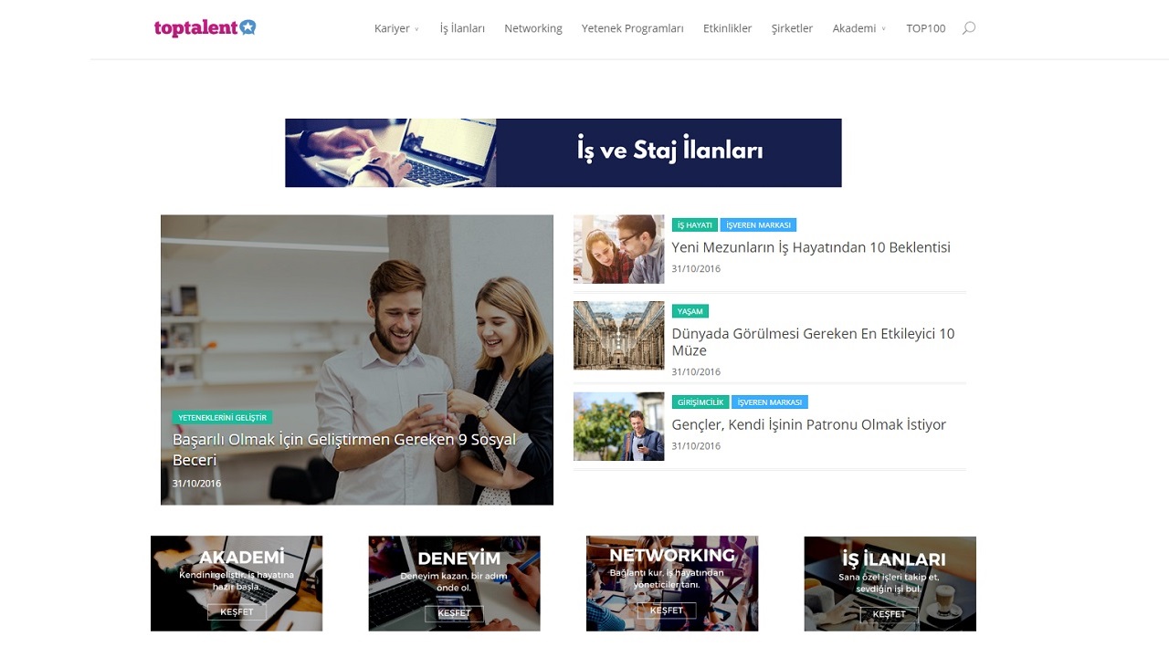 Toptalent.co sadece iş ve staj ilanı yayınlayan klasik kariyer platformlarından çok daha yenilikçi kariyer fırsatları sunuyor. Yetenekler toptalent.co’da iş ve staj bulabilecekleri gibi, iş dünyasından profesyonellerle tanışabiliyor, yetenek programlarına katılabiliyor, kariyer etkinliklerini takip edebiliyor ve zengin içeriklerle iş hayatına hazırlanabiliyorlar.