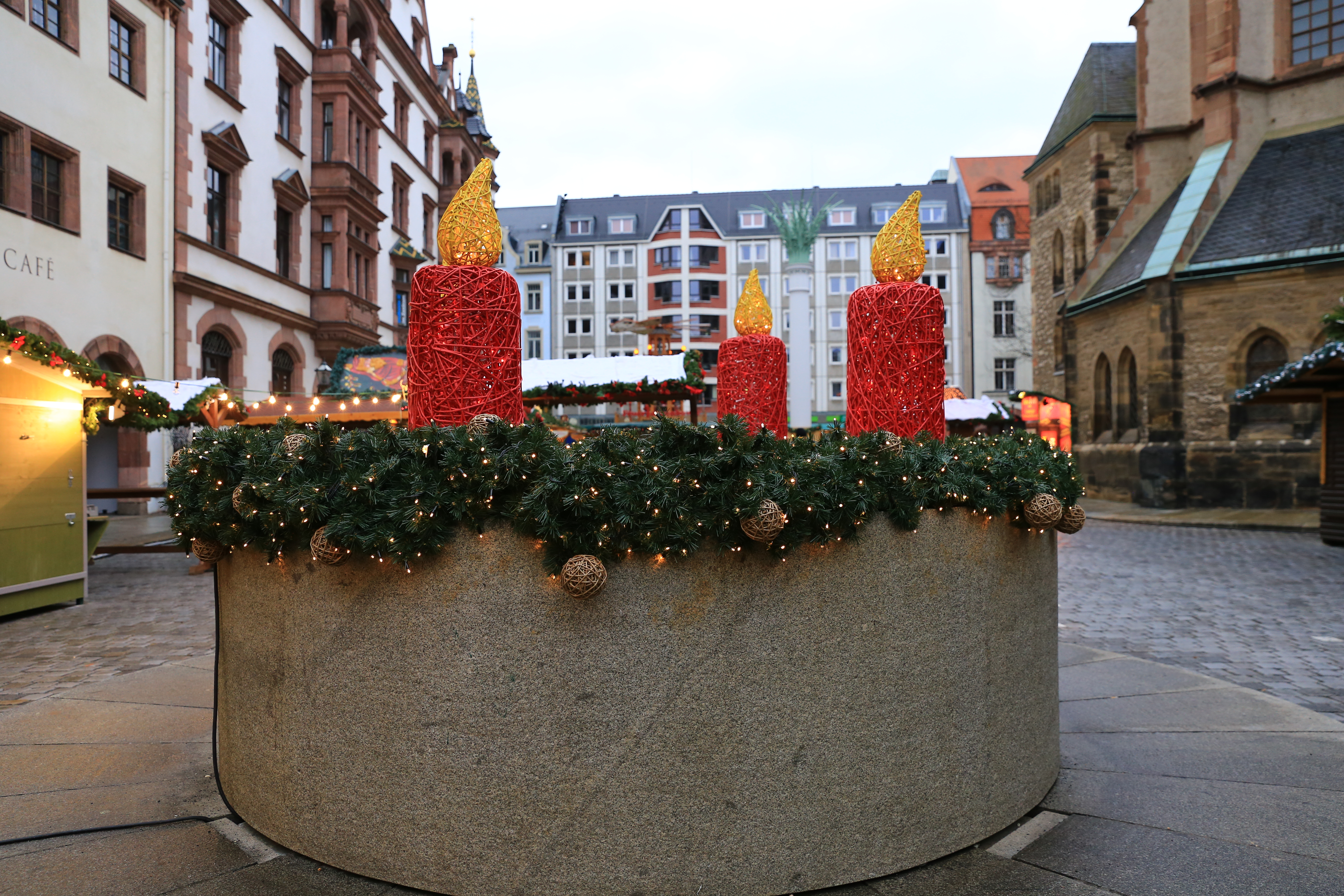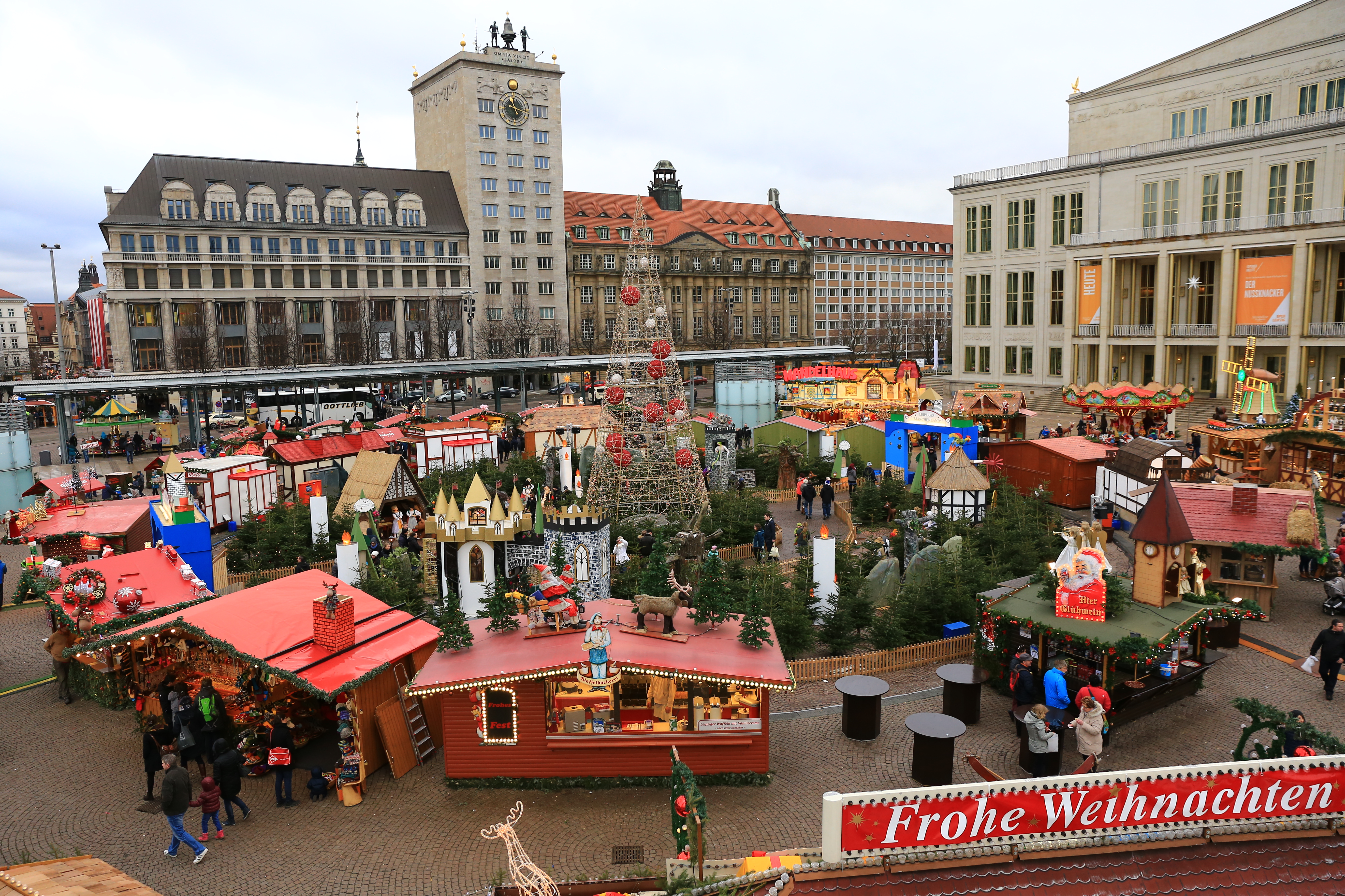 Diğer bir noel pazarı da Augustusplatz’da yer alıyor. Hediyelik eşya tezgahlarının dışında yeme-içme standlarının da yer aldığı pazarda bulunan dönmedolaba binerek şehri kuşbakışı görmeniz de mümkün.
